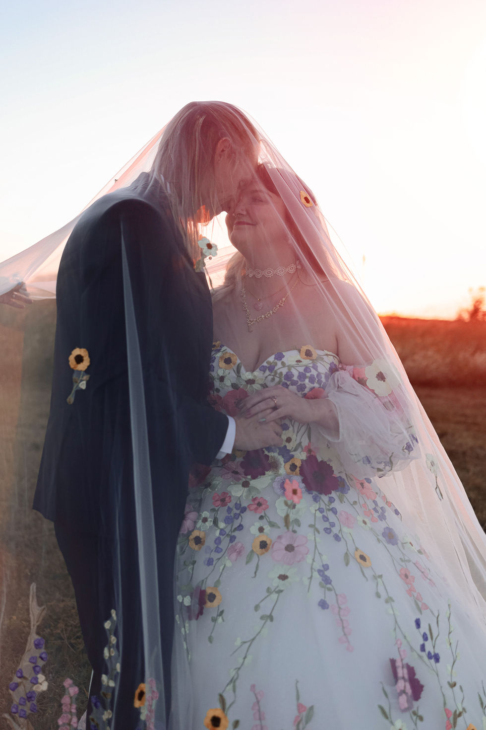 An enchanting collection capturing the intimacy and romance of couples under floral veils at sunset, expressing love and tenderness.